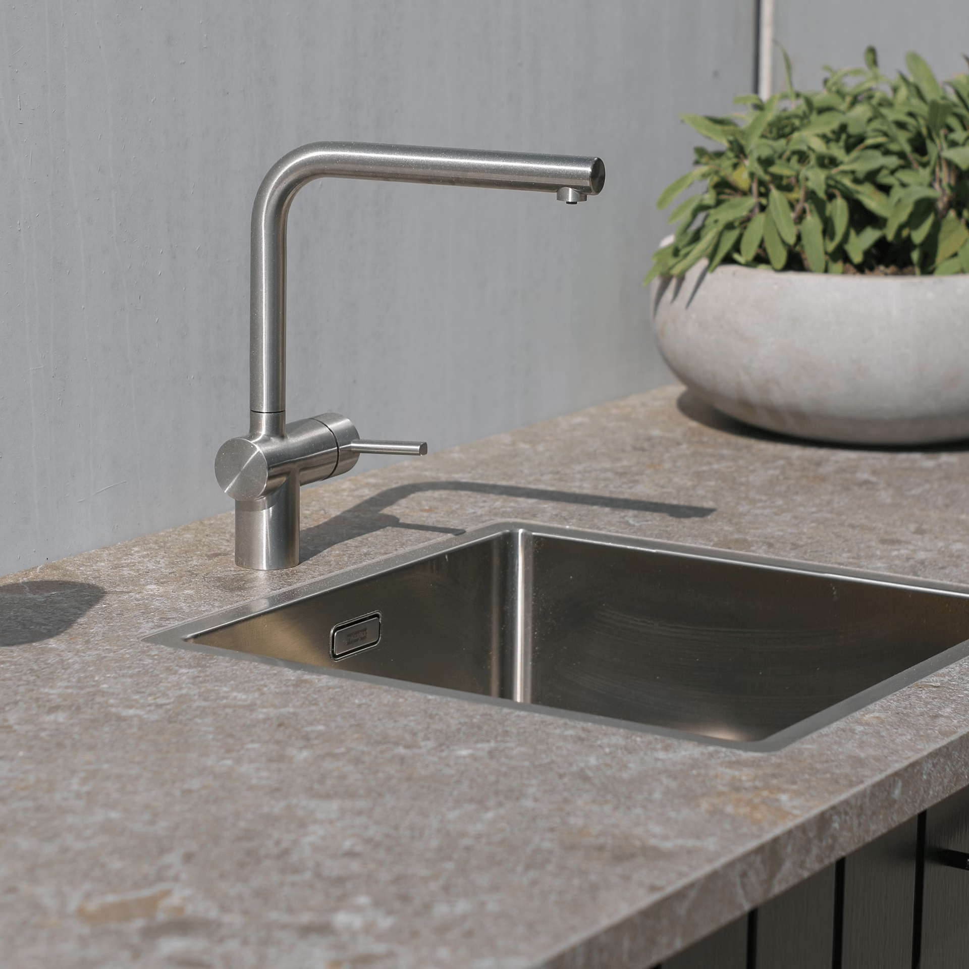 Thanks to the mitres on the fronts, the unusual design of the PURE underlines its discreet and elegant appearance. As usual, the PURE can be planned not only as a wall unit, kitchen block or free-standing island, but also in any shape that suits your outdoor area.
